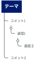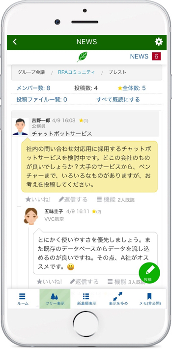 定番のツリー(スレッド)構造&タイムラインの投稿表示機能等で、入り組んだ対話の「見える化」を強力にバックアップします。直感的にディスカッションの流れが把握できます。